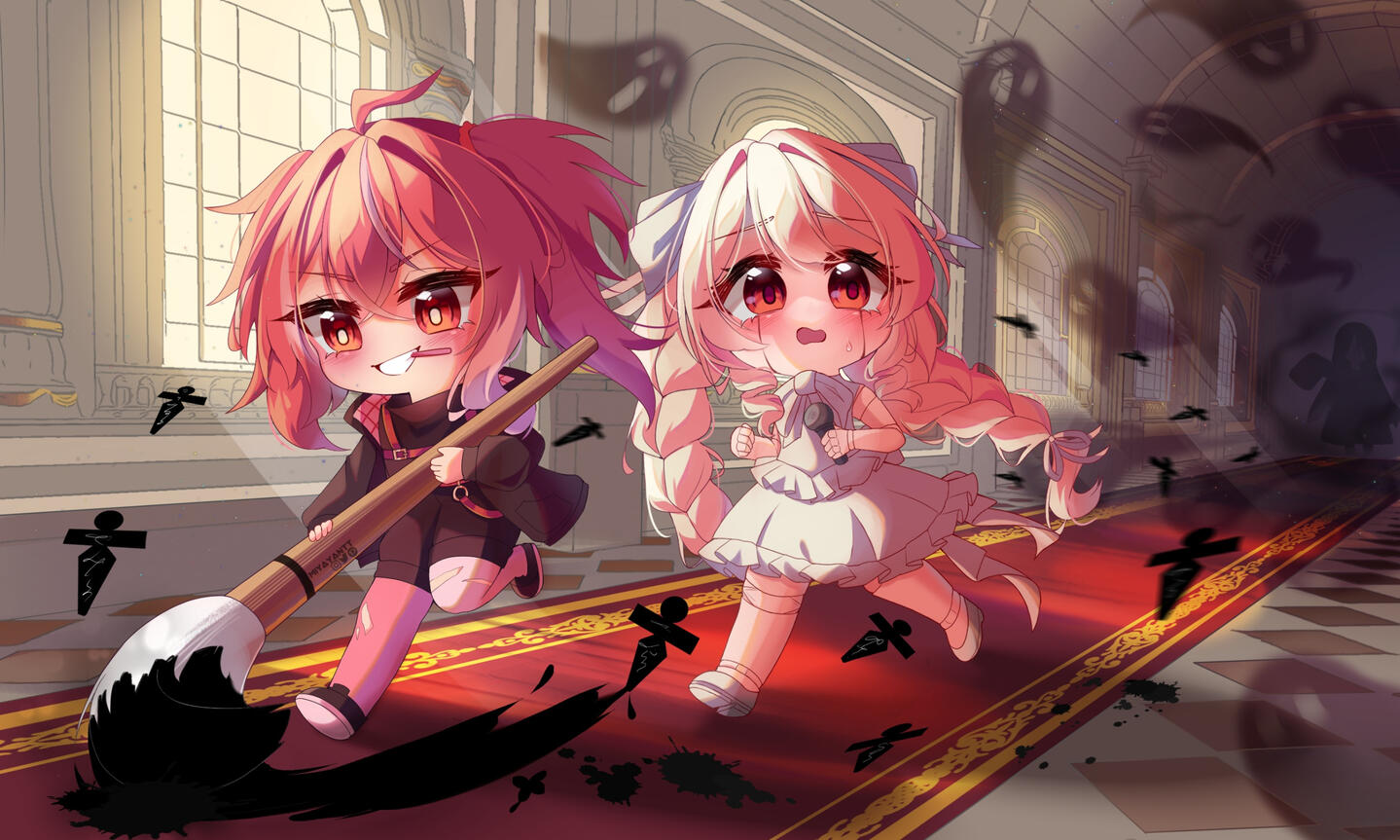 The story behind this characters i drew is two girls trying to escape from being caught by ghosts in a mansion.