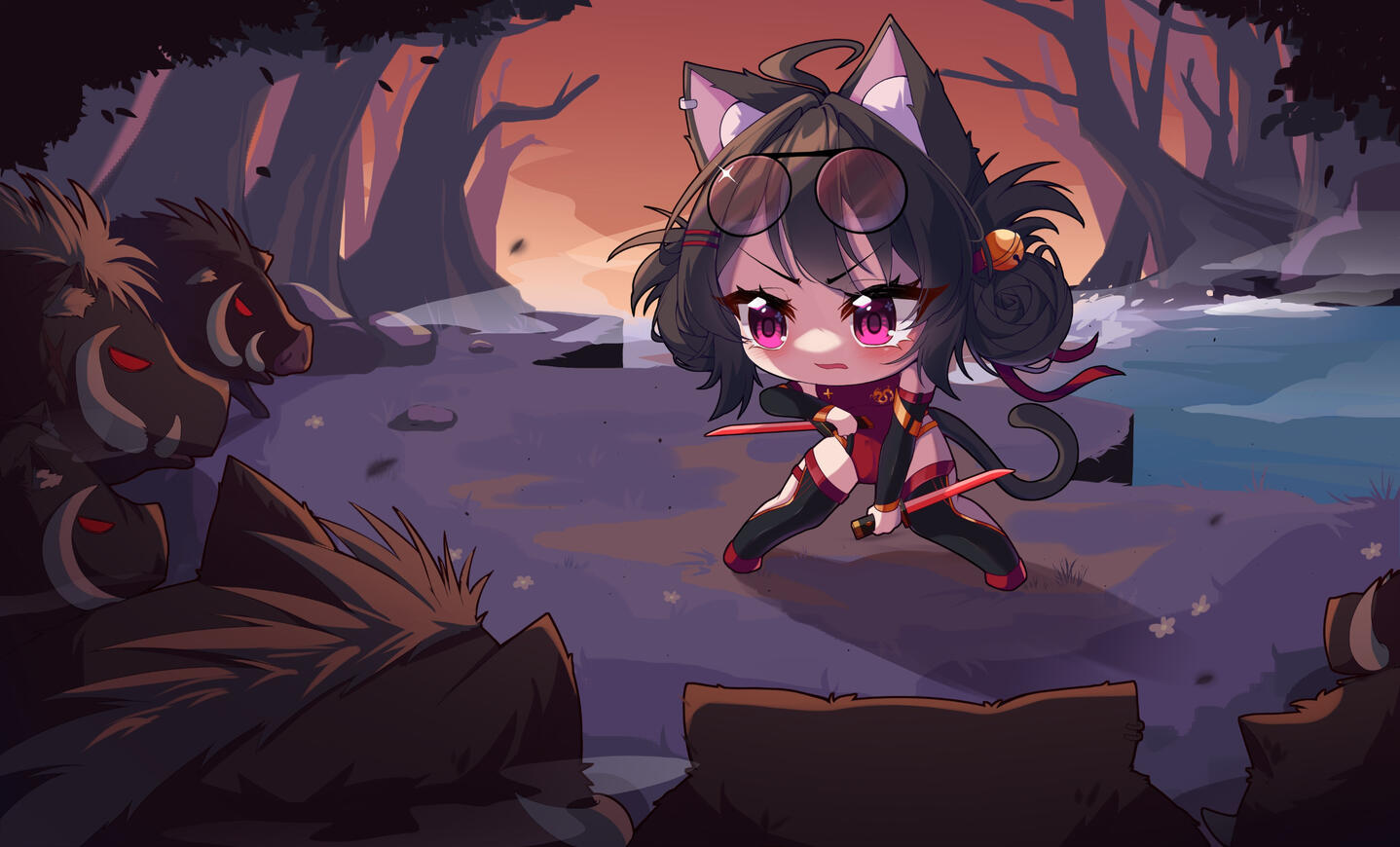 ✦ This project was made for a VTuber, the idea is she fought with wild animals in this situation almost made her fall into the waterfall.